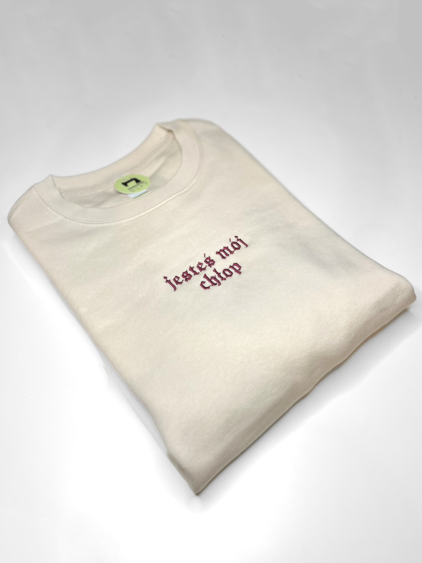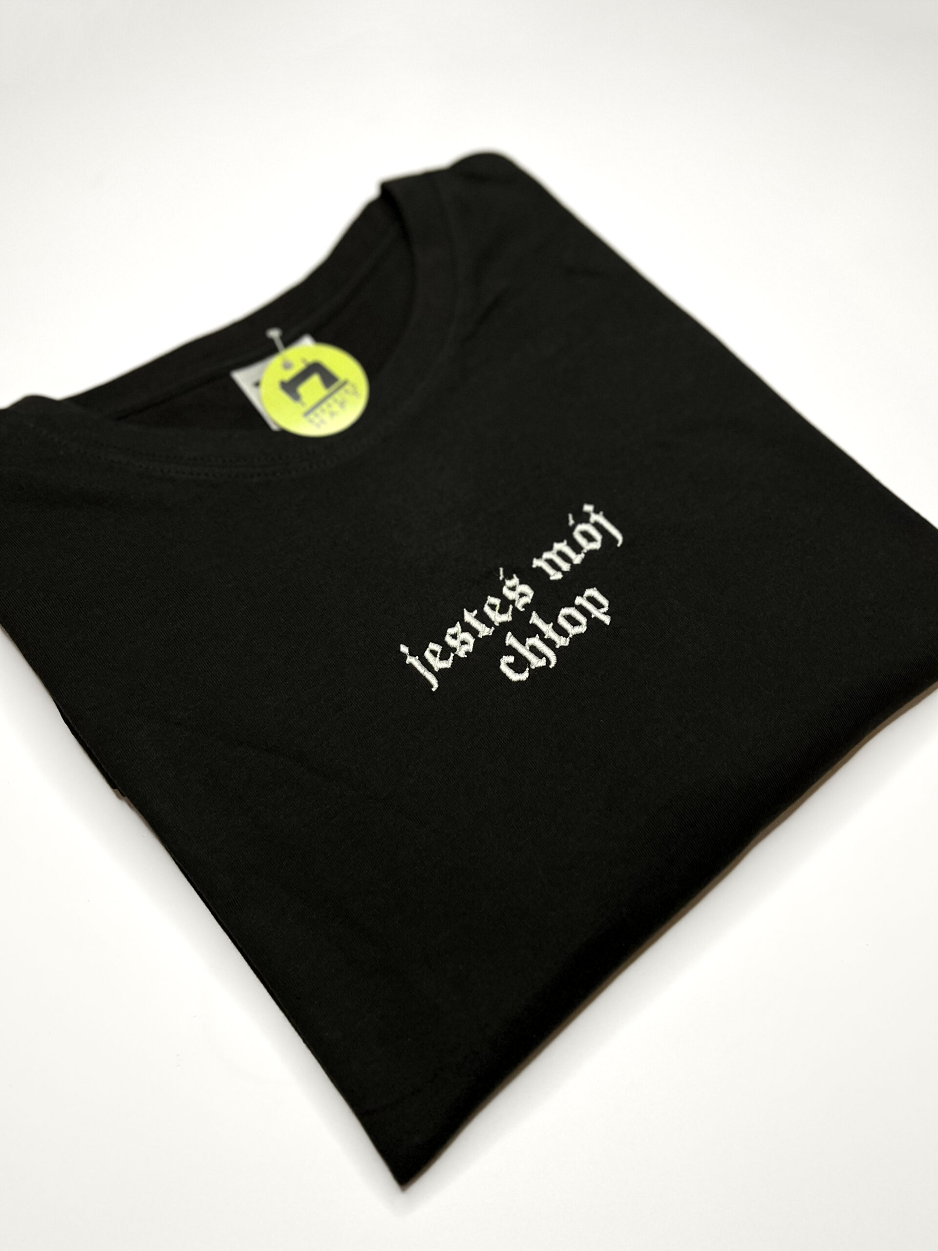 Produkt z haftowanym napisem „jesteś mój chłop”, inspirowanym serialem „1670” – charakterystyczny tekst w minimalistycznej formie, który nawiązuje do klimatu szlacheckiego humoru i relacji znanych z produkcji.