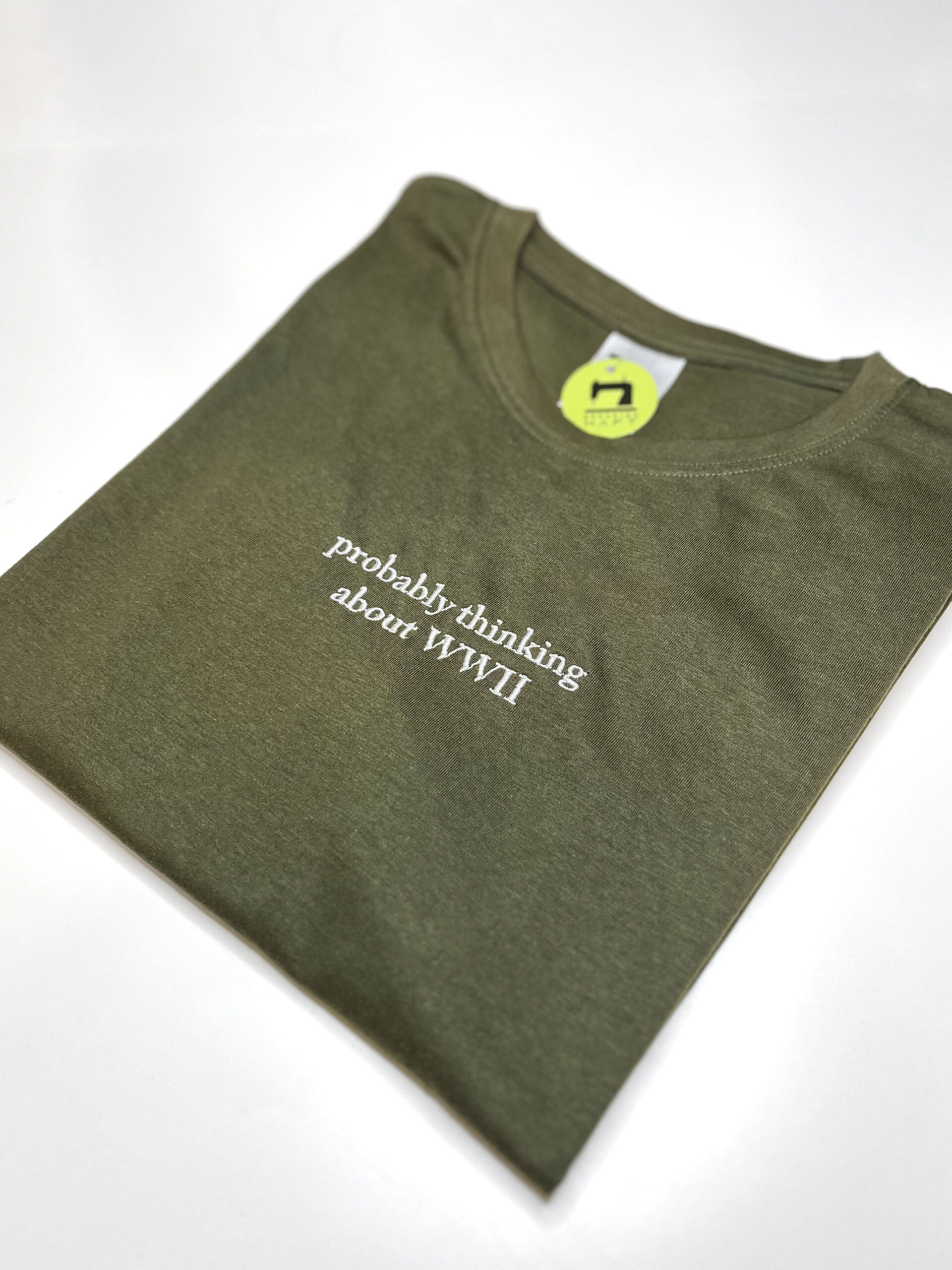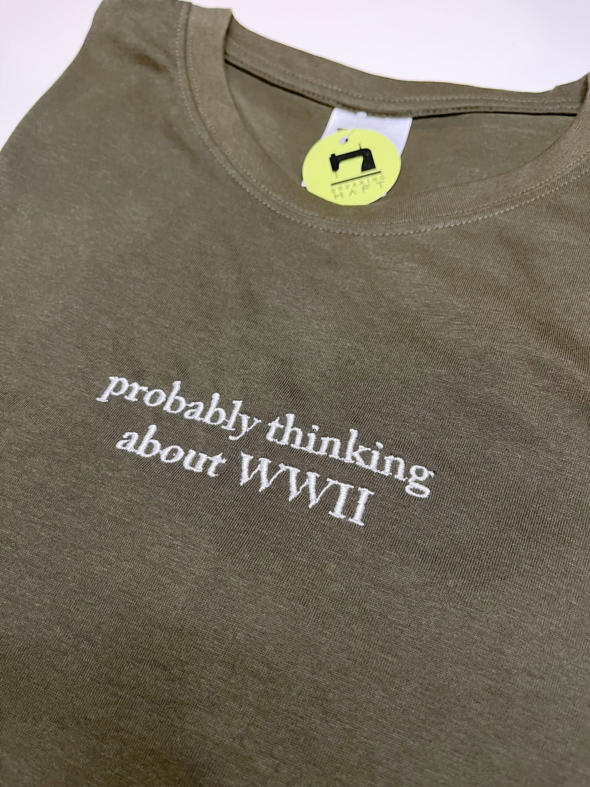 Koszulka „Probably thinking about WWII” z minimalistycznym haftem dla osób z poczuciem humoru i zamiłowaniem do nietypowych napisów. Starannie wykonany haft zapewnia trwałość i estetyczny wygląd. Świetna na prezent lub jako oryginalny element codziennej stylizacji.