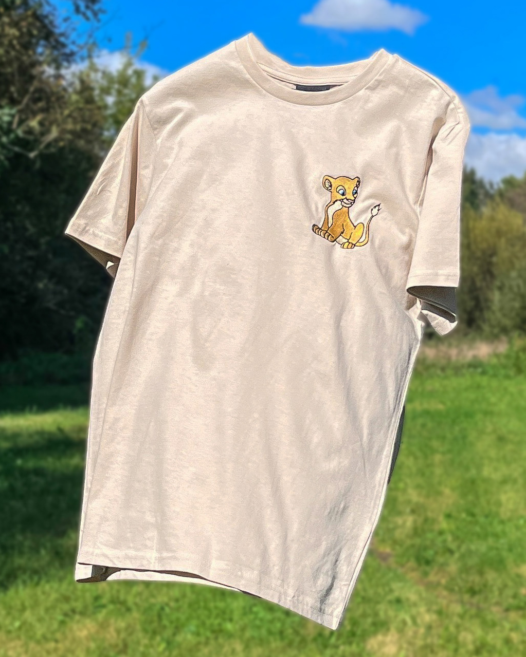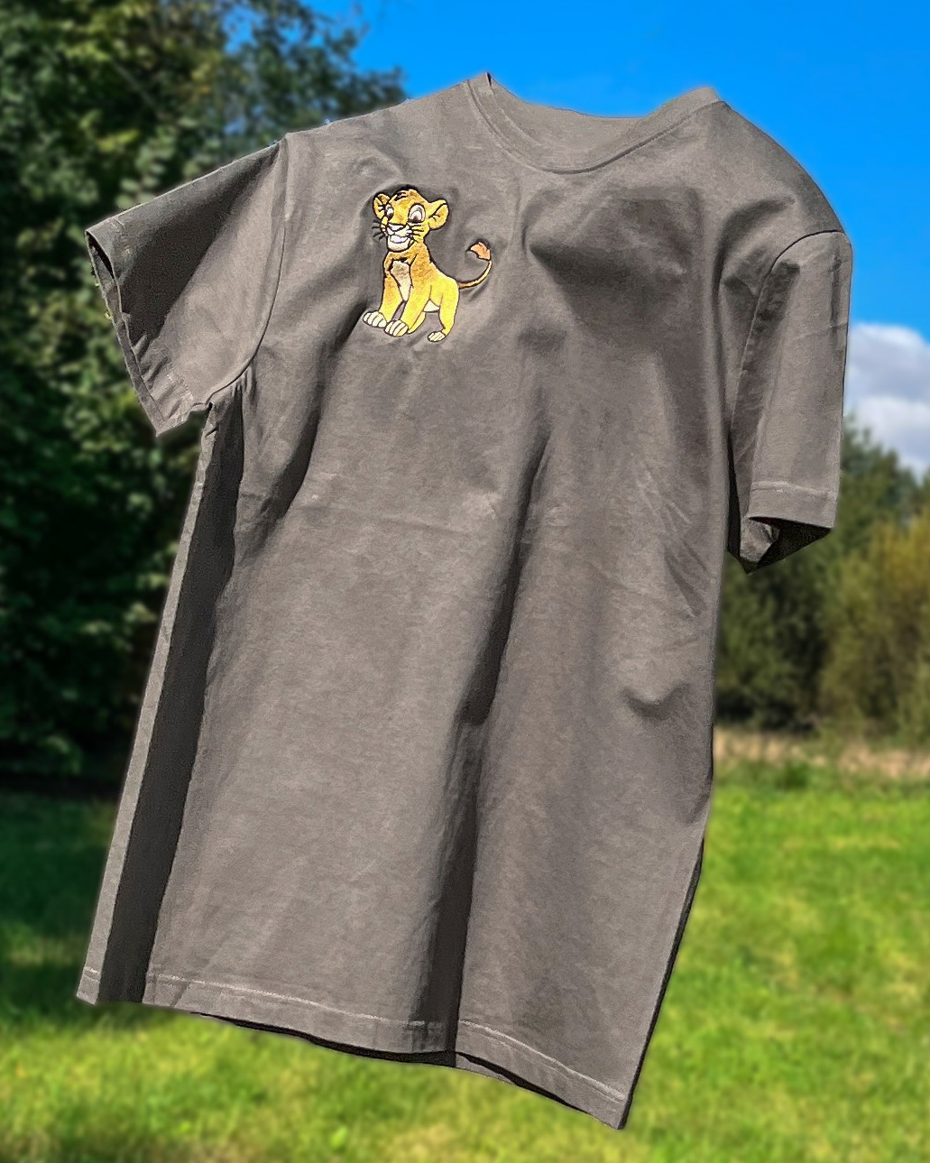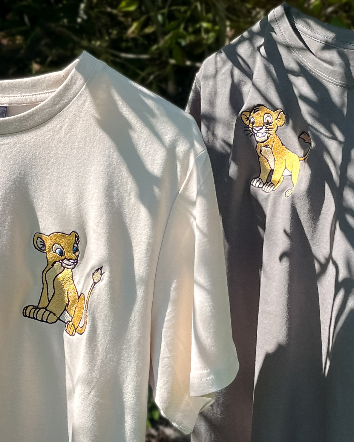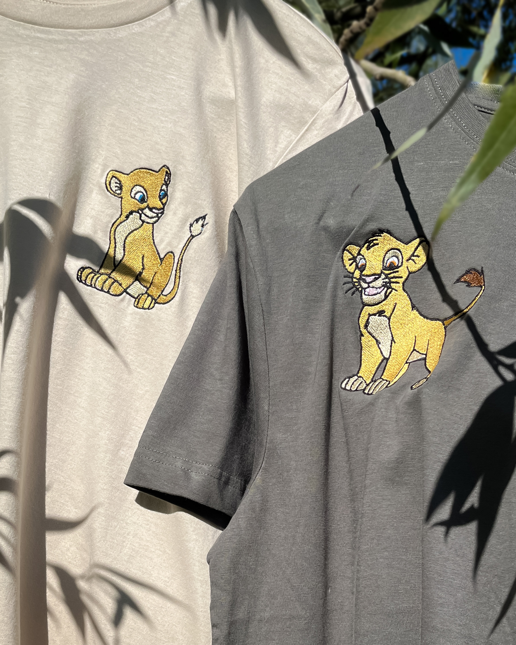 Koszulka z precyzyjnym haftem Simby i Nali – dwóch głównych bohaterów „Króla Lwa”.