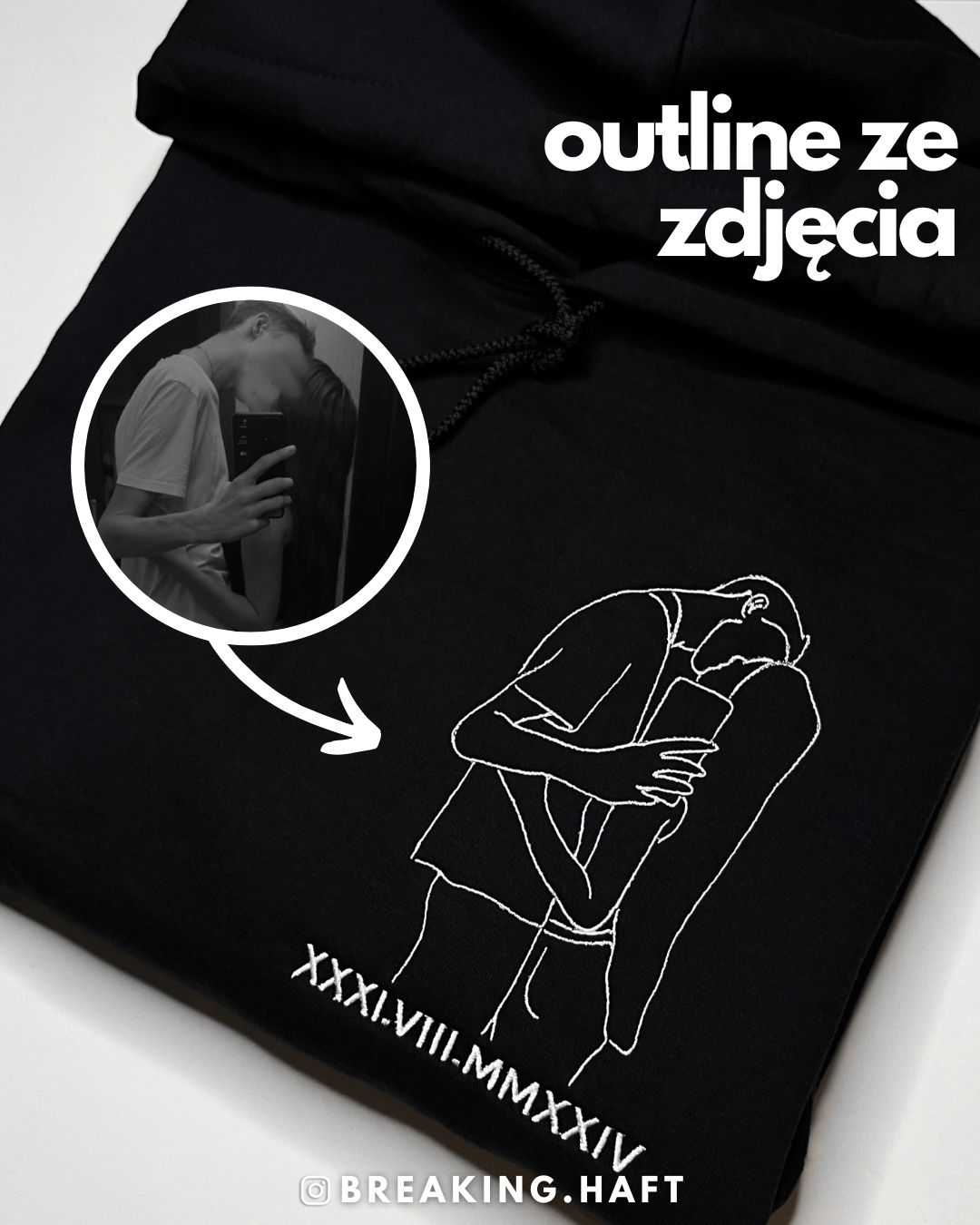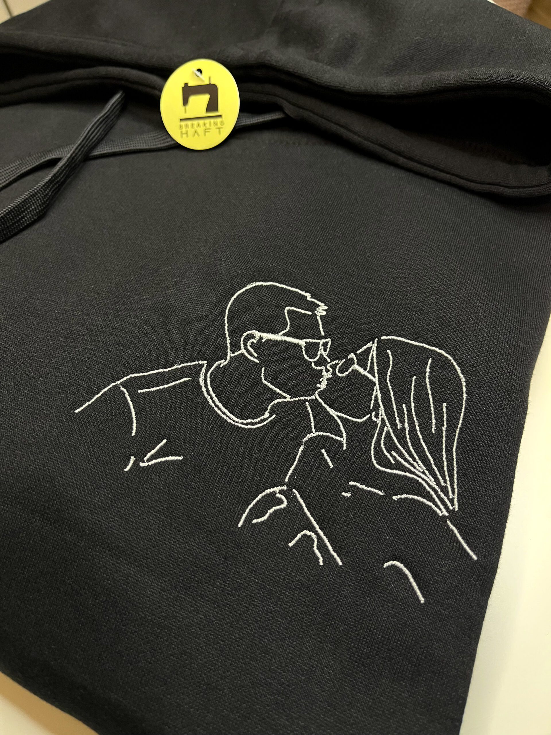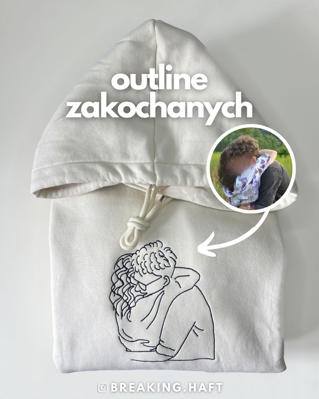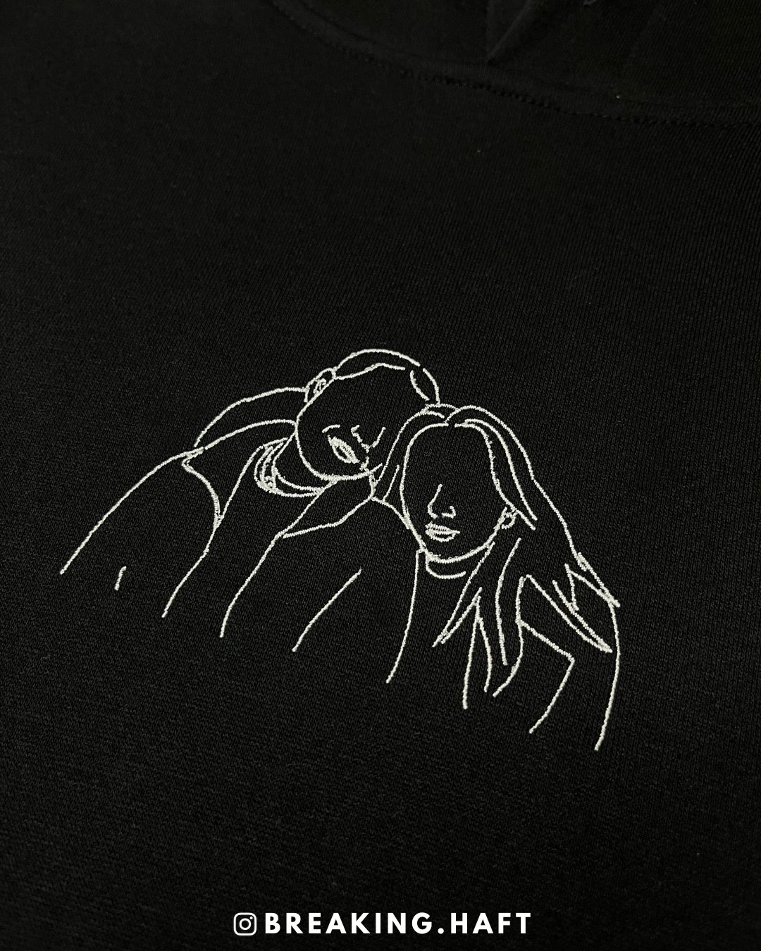 Produkt przedstawia haft outline wykonany na podstawie przesłanego zdjęcia, obejmujący jedną lub dwie osoby. Projekt tworzony jest w minimalistycznym stylu liniowym, który oddaje najważniejsze kształty i charakter sylwetki, zachowując estetykę i czytelność wzoru.