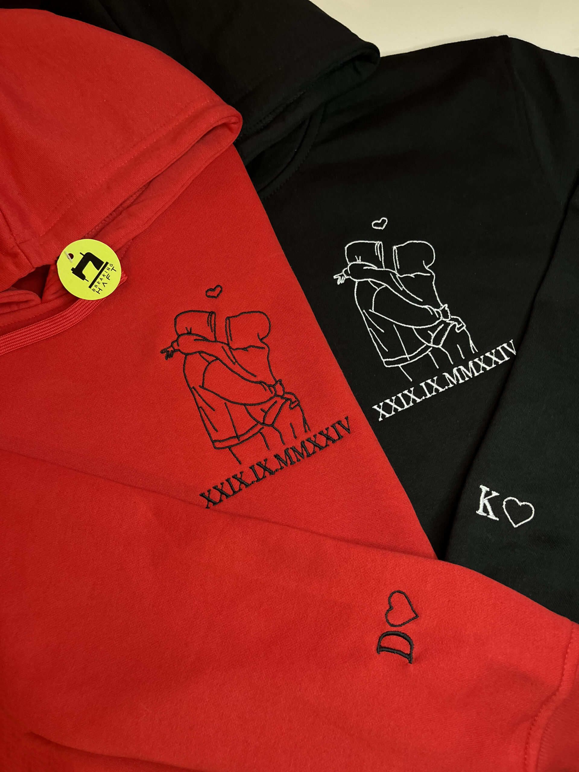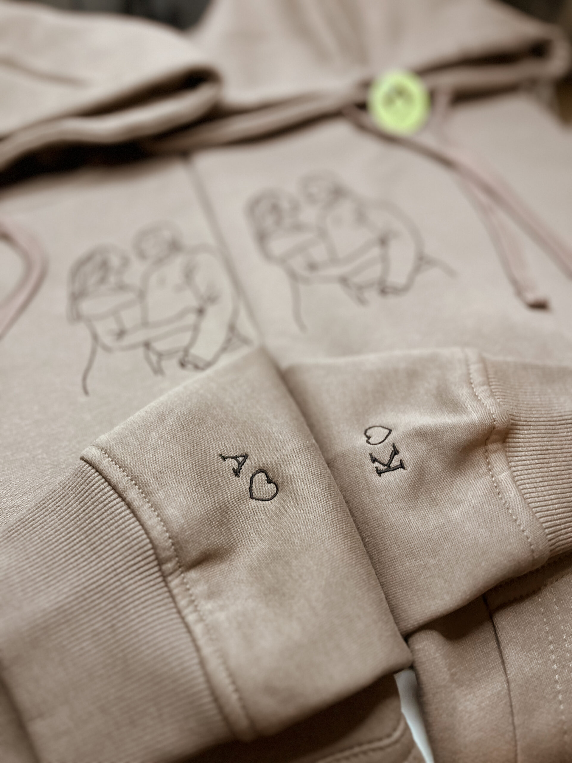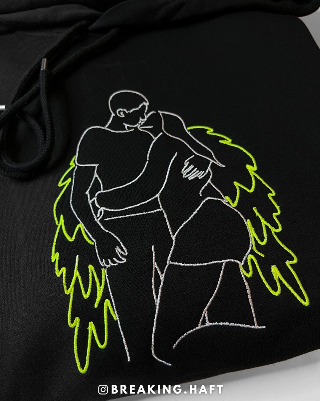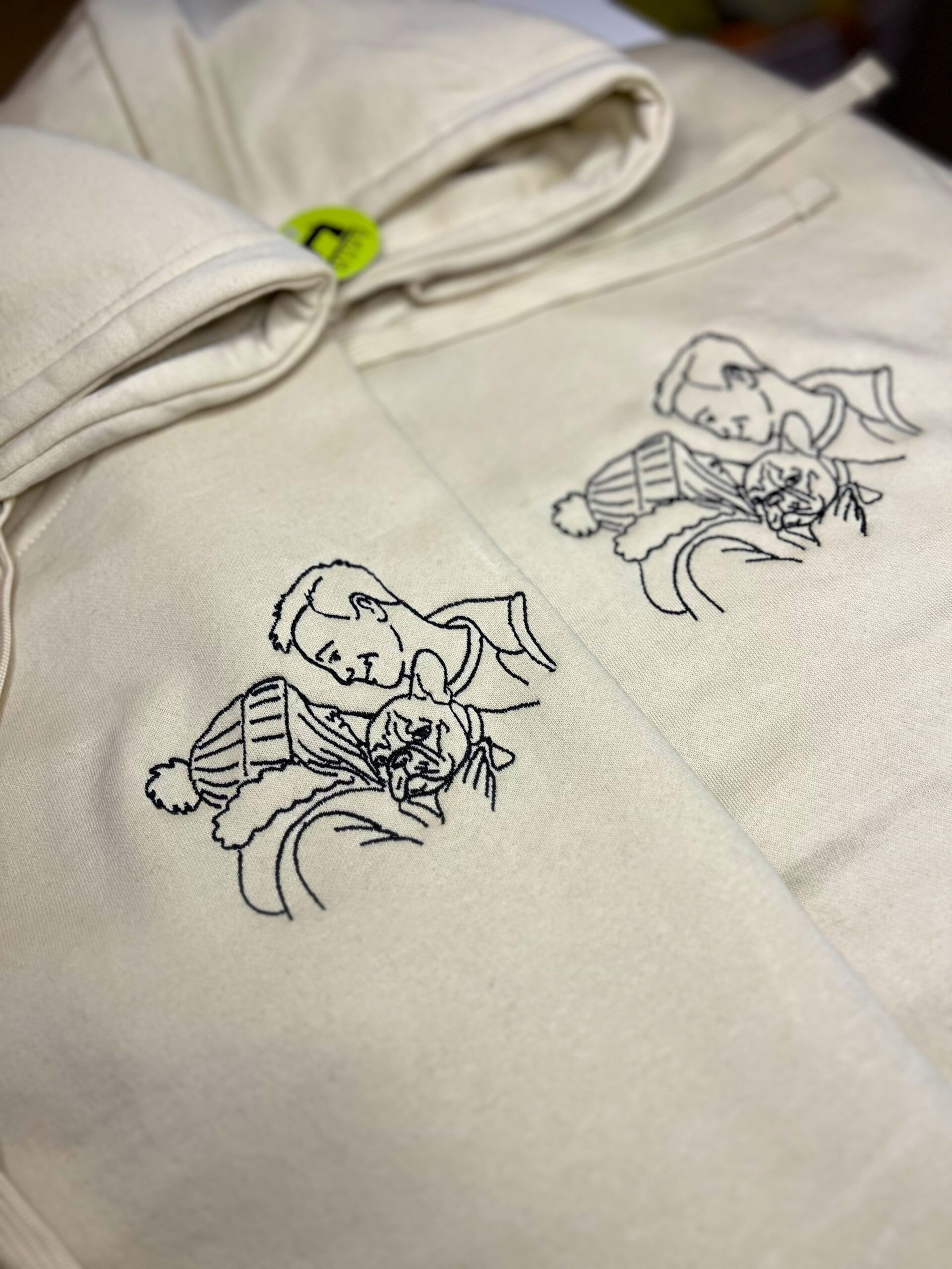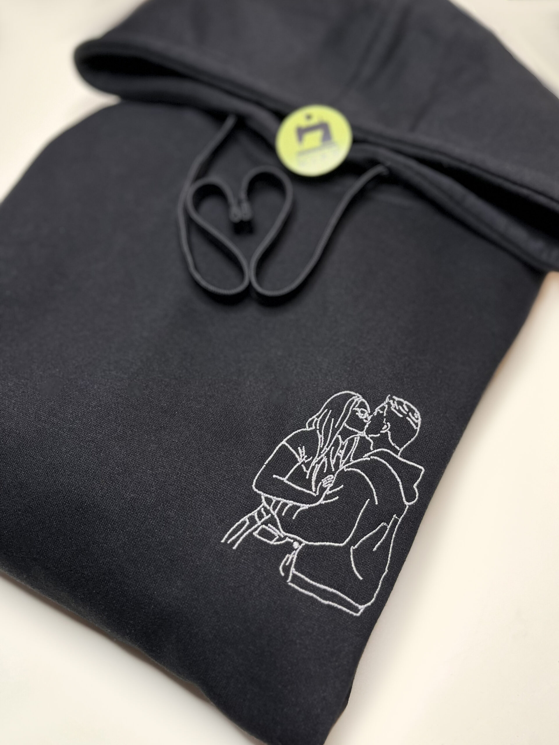 Produkt przedstawia haft outline wykonany na podstawie przesłanego zdjęcia, obejmujący jedną lub dwie osoby. Projekt tworzony jest w minimalistycznym stylu liniowym, który oddaje najważniejsze kształty i charakter sylwetki, zachowując estetykę i czytelność wzoru.