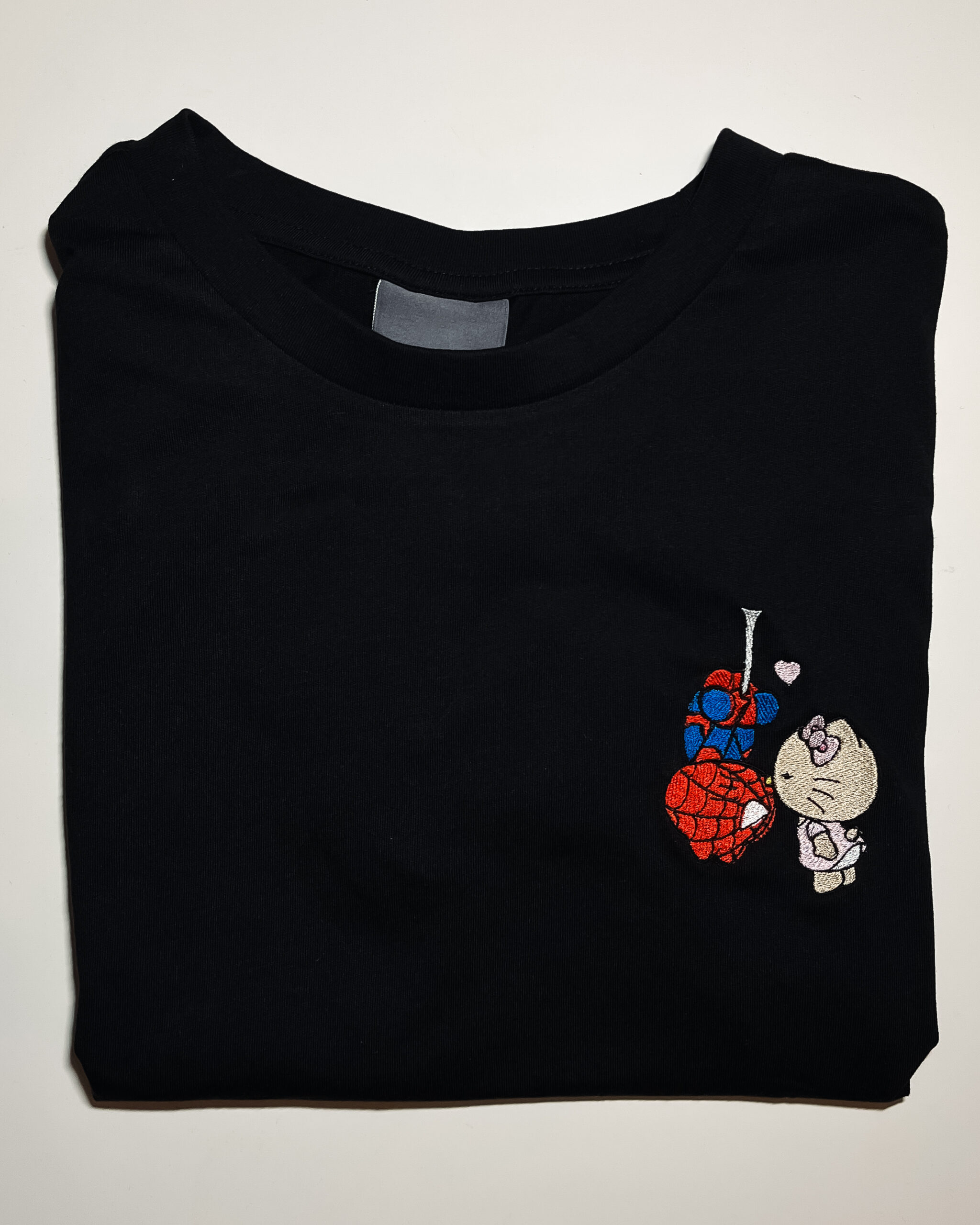 Koszulka z precyzyjnym haftem, na którym razem pojawiają się Spider-Man i Hello Kitty w oryginalnym stylu.